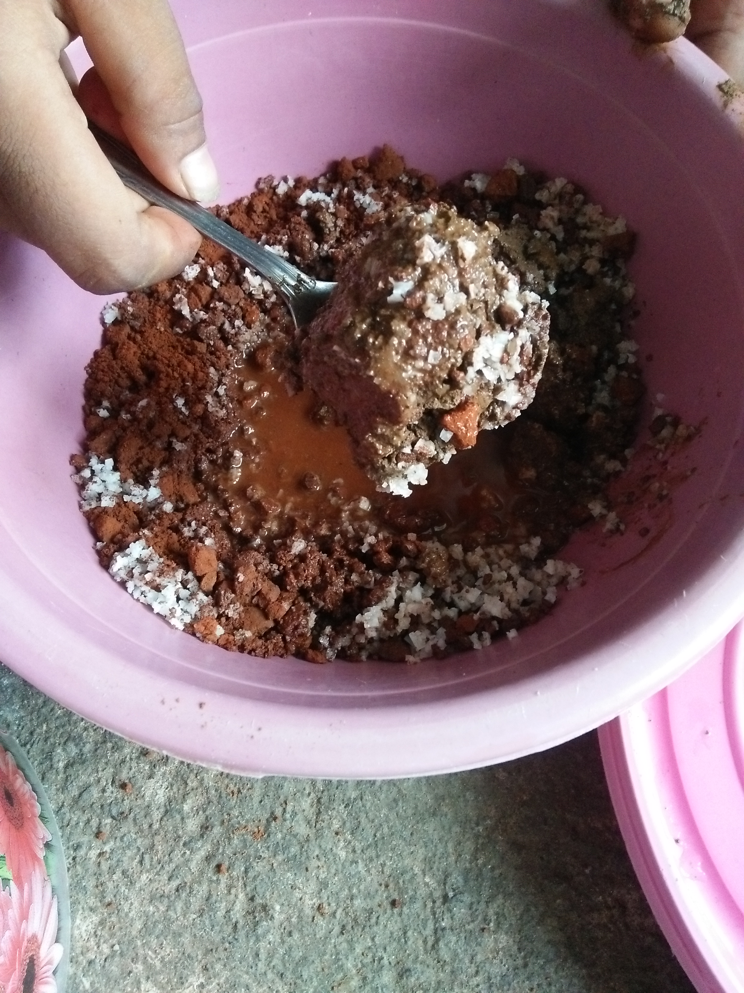 4. Campurkan remukan bata yang sudah benar-benar halus, tanah liat dan air. Aduk rata. Jangan sampai encer. Bentuk hingga seperti pasta.